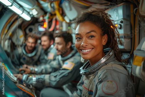 Portrait of female astronaut smiles brightly as she sits beside other astronauts in a spaceship during a space mission