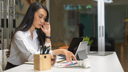 Portrait of female designer concentrating on her project with digital tablets on office desk