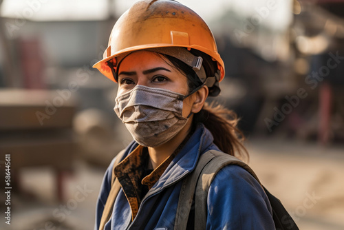 Portrait of female engineer in safety vest with helmet on a construction site. Gnereative ai.