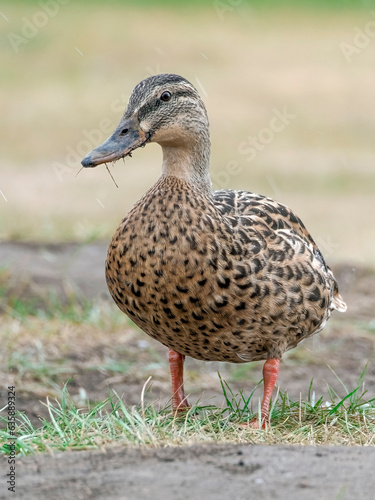 Portrait of female of mallard on the field. Close-up, blurred background