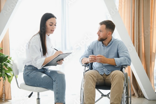 Portrait of female psychiatrist interviewing handicapped man during therapy session, copy space.