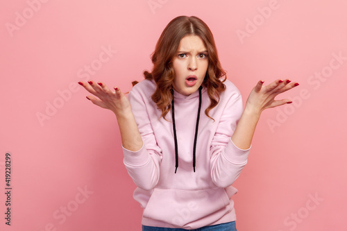 Portrait of frustrated young brunette female in hoodie spreading hands with shock and misunderstanding, what do you want gesture. Indoor studio shot isolated on pink background