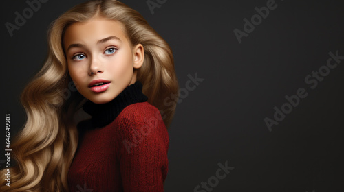 girl, portrait, fashion, teenage, white, isolated, black, background, blond, hair, preteen, young, children, woman, coiffure, red, sweater, studio, copy space, female, face, christmas, sale, advertising, model, make-up, indoor, inside, 1, people, luxury, head shot, advertisement, shopping, elegant, glamour, children, beautiful, beauty, charming