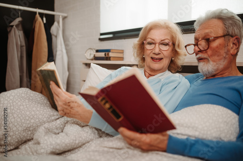 Portrait of good looking elderly couple wearing glasses are reading favorite books while lying in bed at bedroom.