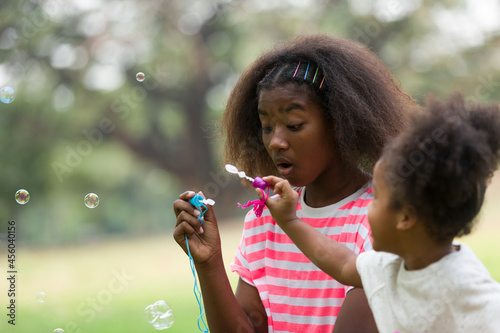 Portrait of group African American curly hairstyle girl playing blowing soap bubbles outdoor. Cute kid girl playing soap bubbles with green nature background in the park