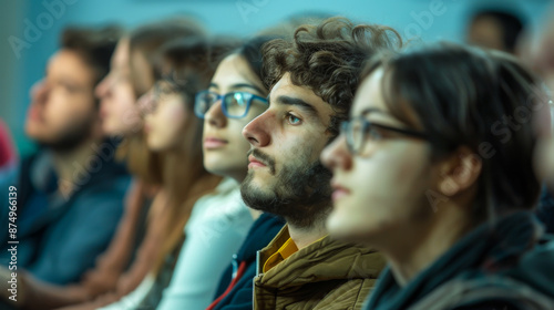 Portrait of group of students during a lesson in a italian university, group of students focused listening to the professor