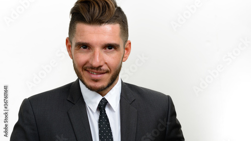 Portrait of handsome bearded Hispanic businessman in suit