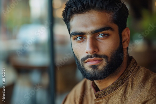 Portrait of handsome bearded Indian man looking at camera while sitting in cafe