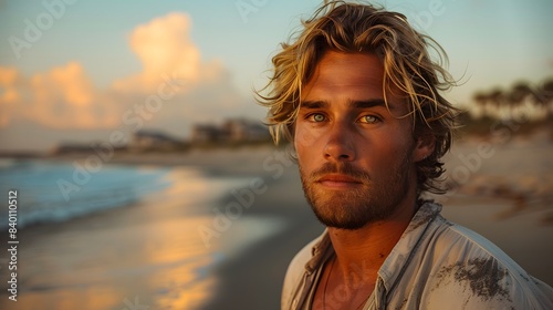 man, beach, outdoors, vacation, sea, young adult, summer, heaven, individuality, relaxation, sand, smiling, standing, vitality, portrait, ocean, beauty, blue, activity, casual clothes, young, happiness, blond, walking, calmness, person, body, front view, water, toothy smile, sunny, avocation, travel