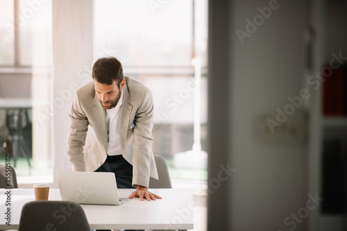 Portrait of handsome businessman. Man working on lap top and drinking coffee