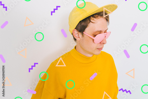 portrait of handsome guy in pink painted sunglasses, yellow baseball cap and oversize pullover among memphis geometry figures. crazy surreal art ..