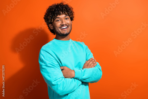 Portrait of handsome indian man curly hair crossed hands posing for local arabian outlet store isolated on orange color background