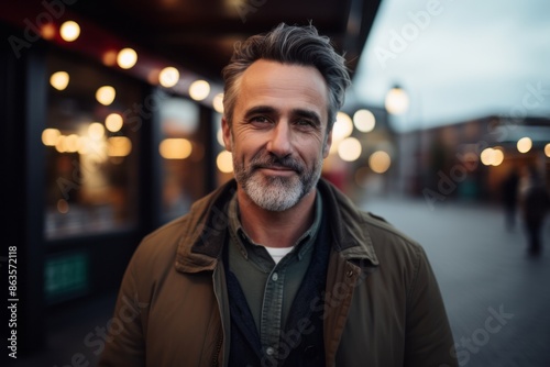 Portrait of handsome middle-aged man with gray hair and beard in city street.