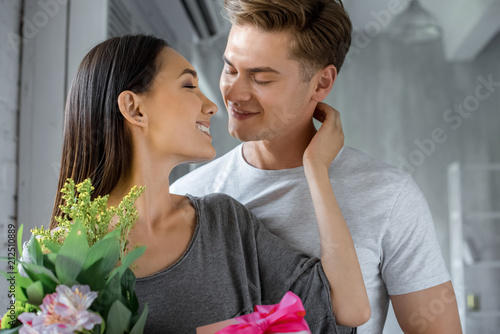 portrait of happy asian girlfriend with present and bouquet of flowers looking at caucasian boyfriend at home