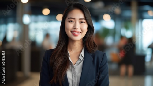 Portrait of happy asian woman smiling standing in modern office space. Generative AI
