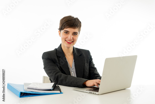 Portrait of happy attractive young businesswoman working on her laptop looking confident