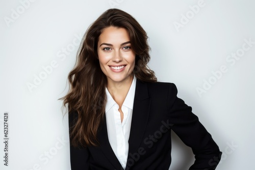 Portrait of happy businesswoman in black suit smiling at camera.