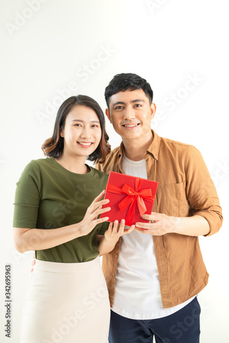 present, adult, people, surprise, female, man, happiness, holding, beautiful, giving, box, happy, young, woman, couple, love, gift, anniversary, boyfriend, girlfriend, attractive, celebration, valentine, cheerful, wife, smiling, romantic, white, asian, vietnamese, korean, japanese, chinese