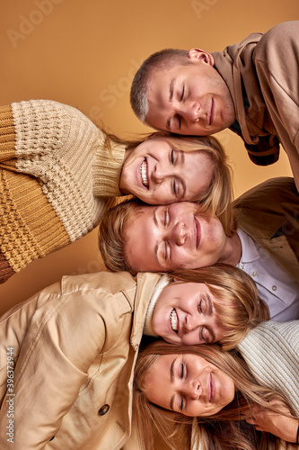 portrait of happy dreamy young people isolated in studio with pastel brown background, beautiful males and females lie on heads of each other