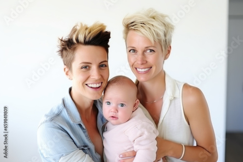 Portrait of happy female Gay couple with baby at home. Concept of lgbt people, lesbian marriage and adoption, homosexual family