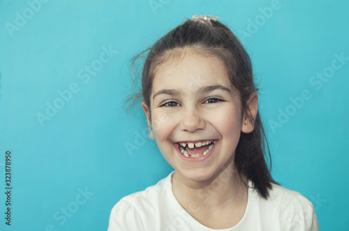 Portrait of happy laughing child girl on blue background. Smiling kid. Positive emotions.