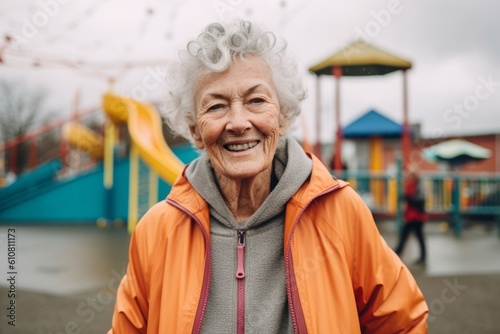 Portrait of happy senior woman smiling at camera while standing on playground
