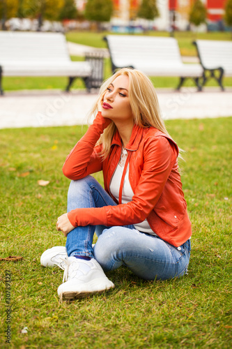 full body, jean, smile, fall, autumn, park, blond, yellow, leaf, maple, red, leather, jacket, sunlight, model, blond, natural, attractive, white, adult, russian, glamour, fashion, beauty, outside, people, 1, female, singlet, portrait, lady, woman, youth, girl, young, face, person, lovely, joy, beautiful, nature, pretty, happy, style, full