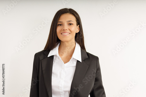 Portrait of happy smiling brunette girl dressed in white shirt and black jacket. Beautiful model on isolated white background. Studio shot of young attractive woman in business suit.