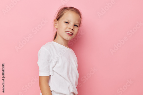 Portrait of happy smiling child girl grimace posing fun isolated background