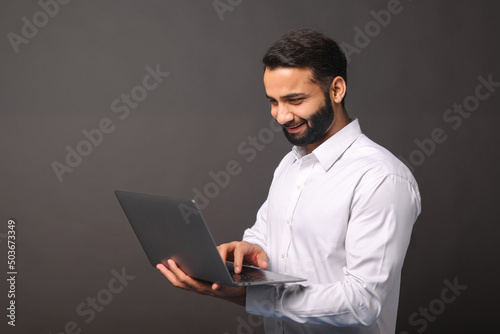 Portrait of happy young bearded Indian man in formal white shirt holding and using laptop computer isolated on black background. Male office employee typing, answering email, copy space
