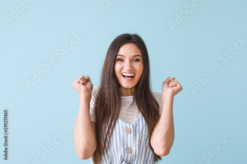Portrait of happy young woman on color background