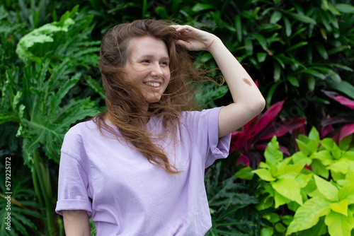 Portrait of happy young woman with breathing deep, inhale fresh air on natural background, green wall with leaves, flower in tropical country in garden. Eco, ecological concept.
