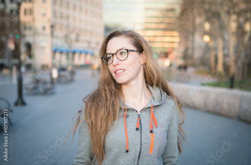 attractive, female, sunrise, brunette, casual attire, caucasian, city, clothes, cute, downtown, girl, goggles, highrise, hipster, portrait, pretty, smart, smile, street, sunset, trendy, walk, woman, nerd, geek, chic, school, college, teenage, teenage