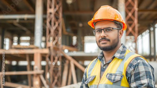 Portrait of Indian male engineer or architect wearing safety helmet and glasses on construction site background