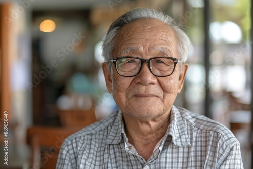 Portrait of Joyful Elderly Asian Man with Glasses looking at camera