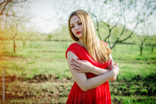 Portrait of light hair girl on red dress background spring garde