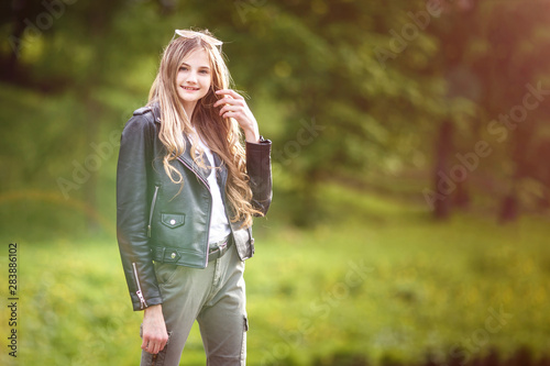 portrait of little beautiful stylish tall kid girl with long hair in leather black jacket in city park on green forest background