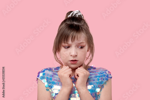 Portrait of little frightened girl. The girl looks to the bottom and to the side