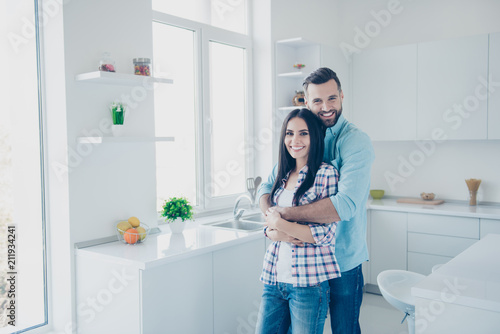 Portrait of lovely modern couple embracing in white kitchen with interior looking at camera wearing casual clothes enjoying time together