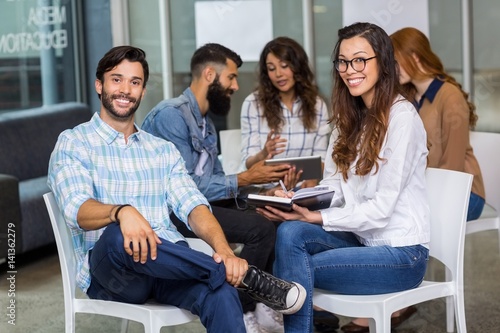 office, meeting, sitting, female, male, friendship, executive, casual attire, communication, professional, dependability, development, interact, spectacle, discussion, discussing, confidence, leadership, occupation, profession, expertise, lifestyle, corporate, executive, colleague, workplace, organiser, business, creative, planning, strategy, co-worker, clothing, together, cheerful, teamwork, portrait, smiling, company, talking, holding, success, growth, career, friends, modern, youth, chair, happy, and