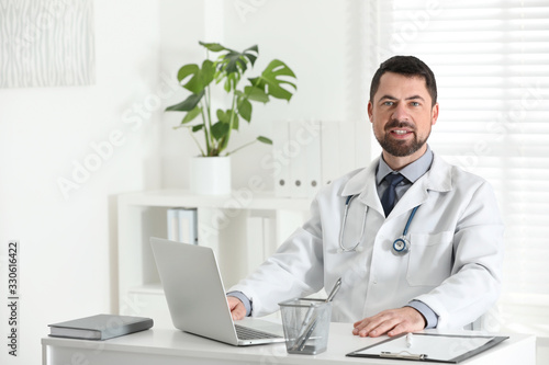 white, coat, robe, medic, desk, clinic, hospital, smart, confident, sitting, stethoscope, clipboard, smiling, happy, middle, aged, mature, man, male, laptop, computer, technology, care, health, specialist, room, consultation, appointment, caucasian, portrait, uniform, doctor, medicals, profession, job, occupation, office, workplace, professional, work, medicine, service, business, person, adult, table, background