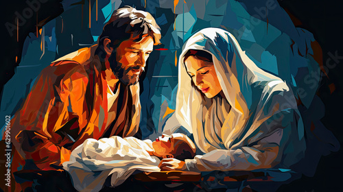 Portrait of Mary and Joseph with baby Jesus in a manger. Nativity of Jesus. Christmas concept.