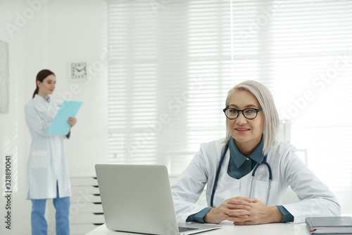 coat, white, desk, eyewear, clinic, hospital, smart, confident, sitting, goggles, stethoscope, smiling, happy, young, middle, aged, mature, female, woman, laptop, computer, technology, care, health, specialist, room, consultation, appointment, caucasian, portrait, colleague, people, uniform, doctor, medicals, profession, job, occupation, office, workplace, professional, work, medicine, service, business, adult, table, background