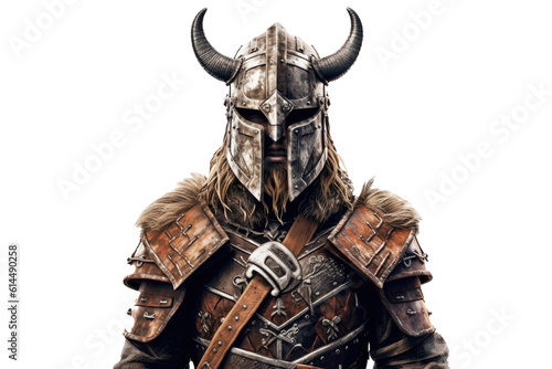 Portrait of medieval Scandinavian or Viking warrior with armor and helmet costume isolated on clear png background, epic fantasy world, with Generative Ai.