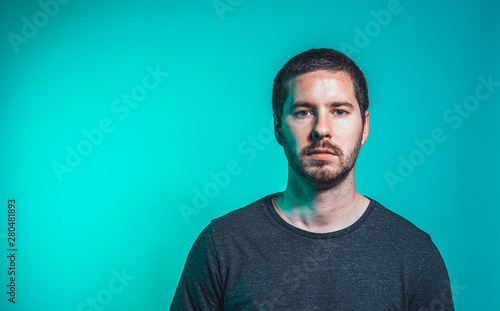 man, people, adult, male, portrait, one person, young adult, studio shot, casual clothes, looking, serious, confidence, human face, one man only, young men, indoor, copy space, lifestyle, real people, beard, t-shirt, front view, standing, fashion, adults only, background, closeup, blue, facial expression, color image, fashion model, thinking, beautiful, staring, cool, attitude, shirt, smiling, stubble field, modern, human head