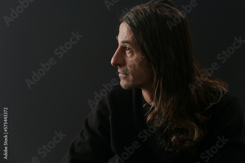 Portrait of middle aged man with long hair on black background