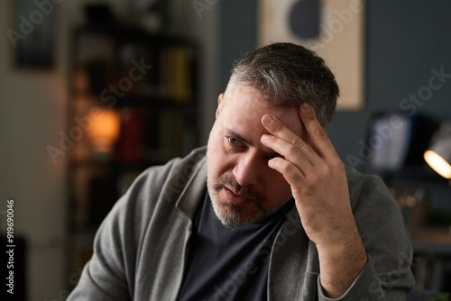 Portrait of middle-aged man resting hand on forehead in office setting, appearing contemplative and thoughtful, with books and shelves in background creating a professional, intellectual atmosphere