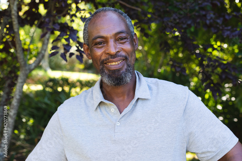 Portrait of mixed race senior man in garden looking at camera and smiling