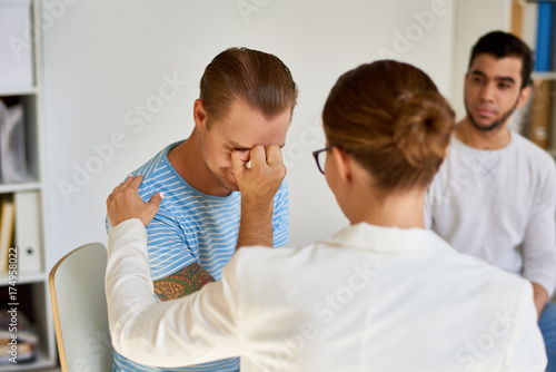 Portrait of modern young man crying while sharing trouble with female psychiatrist in group therapy session