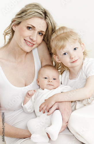 inside, indoor, person, person, people, children, children, baby, infant, girl, baby girl, little girl, daughter, childhood, youth, woman, woman, female, adult, mother, mother, mother, motherhood, family, eltern, parenthood, three, blond, blond, portrait, emotion, emotion, positive, smiling, happiness, happy, affection, love, gentle, hugs, embracing, hug, hugging, sitting, white